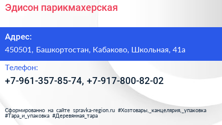 Эдисон, парикмахерская по адресу 450501, Башкортостан, Кабаково, Школьная, 41а в дальнейшем Организация, размещена в следующих категориях: