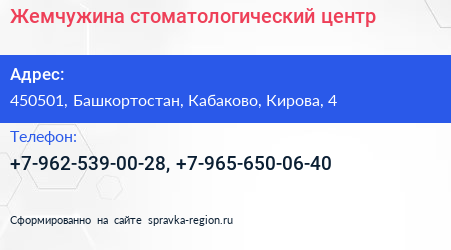 Жемчужина, стоматологический центр по адресу 450501, Башкортостан, Кабаково, Кирова, 4 в дальнейшем Организация, размещена в следующих категориях: