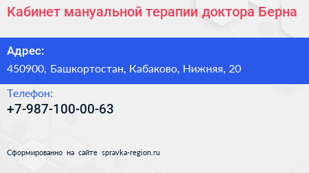 Кабинет мануальной терапии доктора Берна по адресу 450900, Башкортостан, Кабаково, Нижняя, 20 в дальнейшем Организация, размещена в следующих категориях: