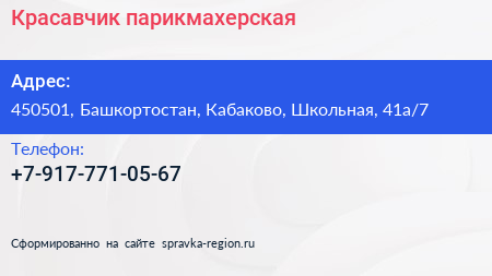 Красавчик, парикмахерская по адресу 450501, Башкортостан, Кабаково, Школьная, 41а/7 в дальнейшем Организация, размещена в следующих категориях: