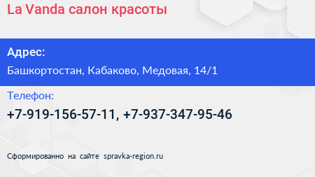 La Vanda, салон красоты по адресу Башкортостан, Кабаково, Медовая, 14/1 в дальнейшем Организация, размещена в следующих категориях:
