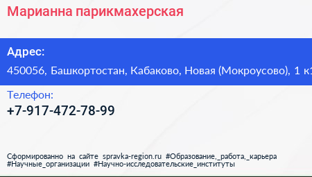 Марианна, парикмахерская по адресу 450056, Башкортостан, Кабаково, Новая (Мокроусово), 1 к1 в дальнейшем Организация, размещена в следующих категориях: