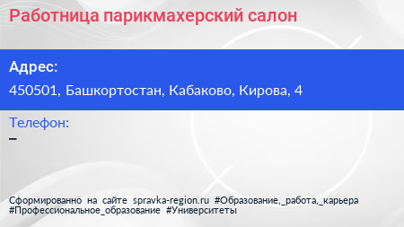 Работница, парикмахерский салон по адресу 450501, Башкортостан, Кабаково, Кирова, 4 в дальнейшем Организация, размещена в следующих категориях: