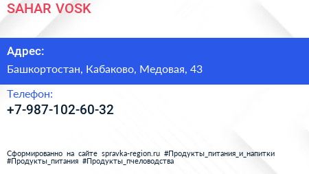 SAHAR & VOSK по адресу Башкортостан, Кабаково, Медовая, 43 в дальнейшем Организация, размещена в следующих категориях: