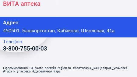 ВИТА, аптека по адресу 450501, Башкортостан, Кабаково, Школьная, 41а в дальнейшем Организация, размещена в следующих категориях: