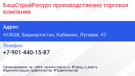 БашСтройРесурс, производственно-торговая компания по адресу 453028, Башкортостан, Кабаково, Луговая, 47 в дальнейшем Организация, размещена в следующих категориях: