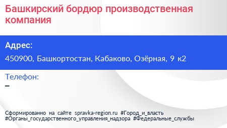 Башкирский бордюр, производственная компания по адресу 450900, Башкортостан, Кабаково, Озёрная, 9 к2 в дальнейшем Организация, размещена в следующих категориях: