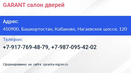 GARANT, салон дверей по адресу 450900, Башкортостан, Кабаково, Нагаевское шоссе, 120 в дальнейшем Организация, размещена в следующих категориях:
