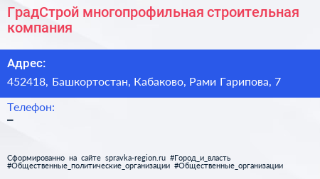 ГрадСтрой, многопрофильная строительная компания по адресу 452418, Башкортостан, Кабаково, Рами Гарипова, 7 в дальнейшем Организация, размещена в следующих категориях: