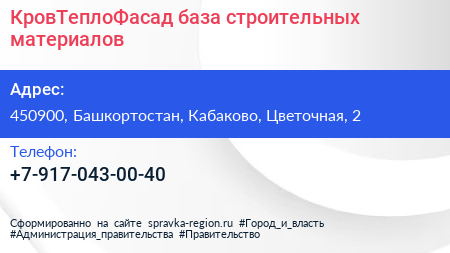КровТеплоФасад, база строительных материалов по адресу 450900, Башкортостан, Кабаково, Цветочная, 2 в дальнейшем Организация, размещена в следующих категориях: