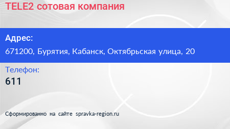 TELE2, сотовая компания по адресу 671200, Бурятия, Кабанск, Октябрьская улица, 20 в дальнейшем Организация, размещена в следующих категориях: