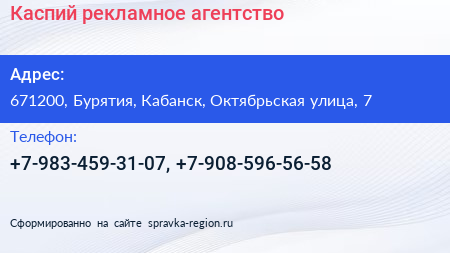 Каспий, рекламное агентство по адресу 671200, Бурятия, Кабанск, Октябрьская улица, 7 в дальнейшем Организация, размещена в следующих категориях: