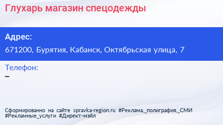 Глухарь, магазин спецодежды по адресу 671200, Бурятия, Кабанск, Октябрьская улица, 7 в дальнейшем Организация, размещена в следующих категориях: