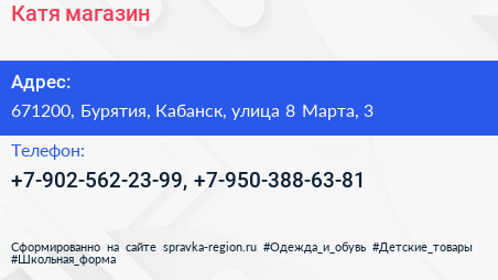 Катя, магазин по адресу 671200, Бурятия, Кабанск, улица 8 Марта, 3 в дальнейшем Организация, размещена в следующих категориях: