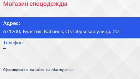 Магазин спецодежды по адресу 671200, Бурятия, Кабанск, Октябрьская улица, 20 в дальнейшем Организация, размещена в следующих категориях:
