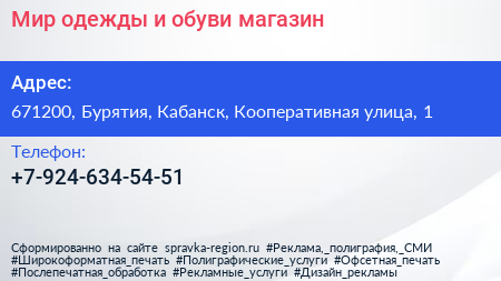 Мир одежды и обуви, магазин по адресу 671200, Бурятия, Кабанск, Кооперативная улица, 1 в дальнейшем Организация, размещена в следующих категориях:
