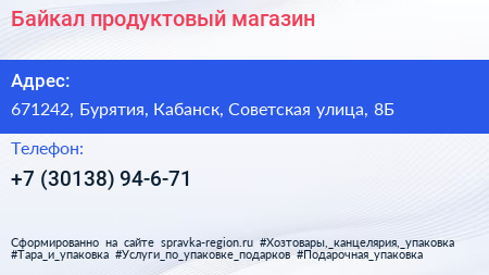 Байкал, продуктовый магазин по адресу 671242, Бурятия, Кабанск, Советская улица, 8Б в дальнейшем Организация, размещена в следующих категориях: