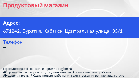 Продуктовый магазин по адресу 671242, Бурятия, Кабанск, Центральная улица, 35/1 в дальнейшем Организация, размещена в следующих категориях: