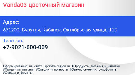 Vanda03, цветочный магазин по адресу 671200, Бурятия, Кабанск, Октябрьская улица, 11Б в дальнейшем Организация, размещена в следующих категориях: