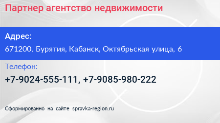 Партнер, агентство недвижимости по адресу 671200, Бурятия, Кабанск, Октябрьская улица, 6 в дальнейшем Организация, размещена в следующих категориях: