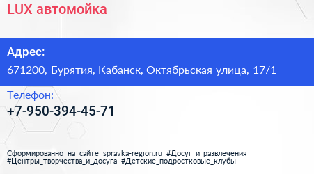 LUX, автомойка по адресу 671200, Бурятия, Кабанск, Октябрьская улица, 17/1 в дальнейшем Организация, размещена в следующих категориях: