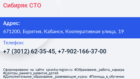 Сибиряк, СТО по адресу 671200, Бурятия, Кабанск, Кооперативная улица, 19 в дальнейшем Организация, размещена в следующих категориях: