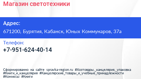 Магазин светотехники по адресу 671200, Бурятия, Кабанск, Юных Коммунаров, 37а в дальнейшем Организация, размещена в следующих категориях: