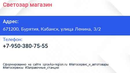 Светозар, магазин по адресу 671200, Бурятия, Кабанск, улица Ленина, 3/2 в дальнейшем Организация, размещена в следующих категориях: