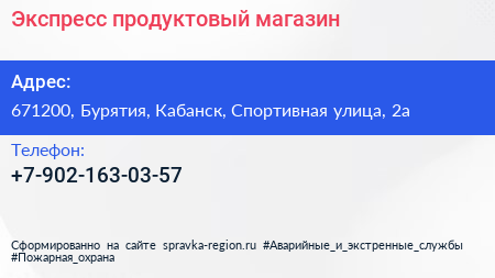 Экспресс, продуктовый магазин по адресу 671200, Бурятия, Кабанск, Спортивная улица, 2а в дальнейшем Организация, размещена в следующих категориях: