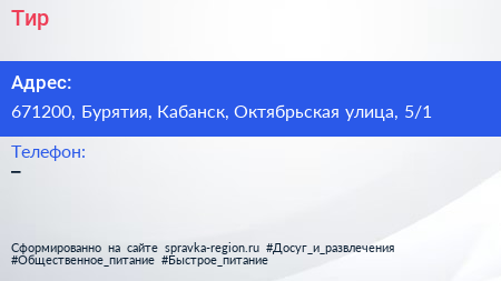 Тир по адресу 671200, Бурятия, Кабанск, Октябрьская улица, 5/1 в дальнейшем Организация, размещена в следующих категориях: