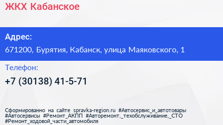 ЖКХ Кабанское по адресу 671200, Бурятия, Кабанск, улица Маяковского, 1 в дальнейшем Организация, размещена в следующих категориях: