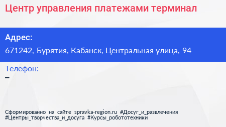 Центр управления платежами, терминал по адресу 671242, Бурятия, Кабанск, Центральная улица, 94 в дальнейшем Организация, размещена в следующих категориях: