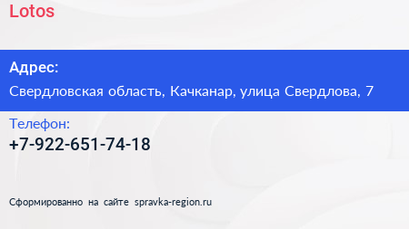 Lotos по адресу Свердловская область, Качканар, улица Свердлова, 7 в дальнейшем Организация, размещена в следующих категориях: