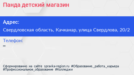 Панда, детский магазин по адресу Свердловская область, Качканар, улица Свердлова, 20/2 в дальнейшем Организация, размещена в следующих категориях: