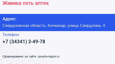 Живика, сеть аптек по адресу Свердловская область, Качканар, улица Свердлова, 4 в дальнейшем Организация, размещена в следующих категориях: