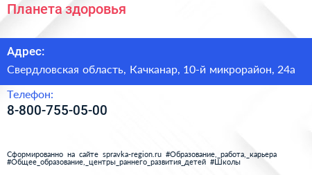 Планета здоровья по адресу Свердловская область, Качканар, 10-й микрорайон, 24а в дальнейшем Организация, размещена в следующих категориях: