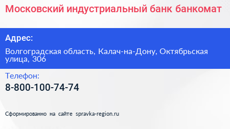 Московский индустриальный банк, банкомат по адресу Волгоградская область, Калач-на-Дону, Октябрьская улица, 306 в дальнейшем Организация, размещена в следующих категориях:
