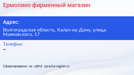 Ермолино, фирменный магазин по адресу Волгоградская область, Калач-на-Дону, улица Маяковского, 17 в дальнейшем Организация, размещена в следующих категориях: