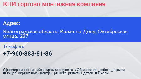 КПИ, торгово-монтажная компания по адресу Волгоградская область, Калач-на-Дону, Октябрьская улица, 287 в дальнейшем Организация, размещена в следующих категориях: