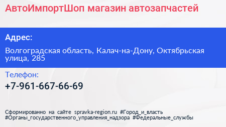 АвтоИмпортШоп, магазин автозапчастей по адресу Волгоградская область, Калач-на-Дону, Октябрьская улица, 285 в дальнейшем Организация, размещена в следующих категориях: