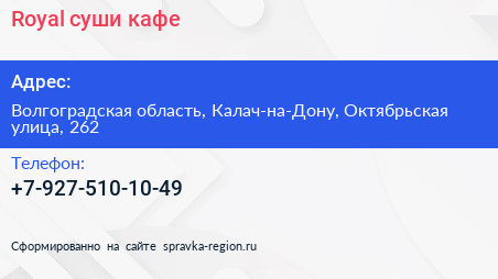 Royal суши, кафе по адресу Волгоградская область, Калач-на-Дону, Октябрьская улица, 262 в дальнейшем Организация, размещена в следующих категориях: