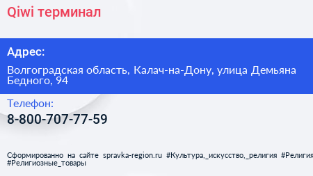 Qiwi, терминал по адресу Волгоградская область, Калач-на-Дону, улица Демьяна Бедного, 94 в дальнейшем Организация, размещена в следующих категориях: