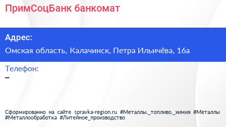 ПримСоцБанк, банкомат по адресу Омская область, Калачинск, Петра Ильичёва, 16а в дальнейшем Организация, размещена в следующих категориях: