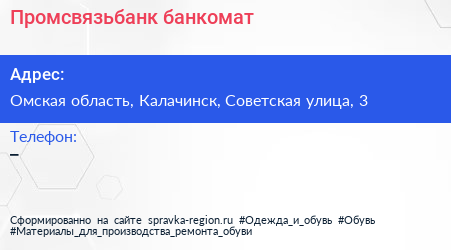 Промсвязьбанк, банкомат по адресу Омская область, Калачинск, Советская улица, 3 в дальнейшем Организация, размещена в следующих категориях: