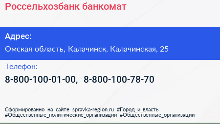 Россельхозбанк, банкомат по адресу Омская область, Калачинск, Калачинская, 25 в дальнейшем Организация, размещена в следующих категориях: