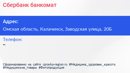 Сбербанк, банкомат по адресу Омская область, Калачинск, Заводская улица, 20Б в дальнейшем Организация, размещена в следующих категориях: