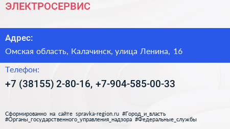 ЭЛЕКТРОСЕРВИС по адресу Омская область, Калачинск, улица Ленина, 16 в дальнейшем Организация, размещена в следующих категориях: