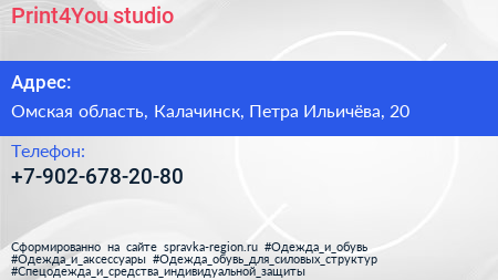 Print4You studio по адресу Омская область, Калачинск, Петра Ильичёва, 20 в дальнейшем Организация, размещена в следующих категориях: