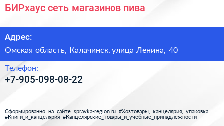 БИРхаус, сеть магазинов пива по адресу Омская область, Калачинск, улица Ленина, 40 в дальнейшем Организация, размещена в следующих категориях: