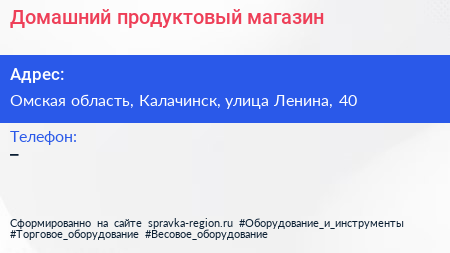 Домашний, продуктовый магазин по адресу Омская область, Калачинск, улица Ленина, 40 в дальнейшем Организация, размещена в следующих категориях: